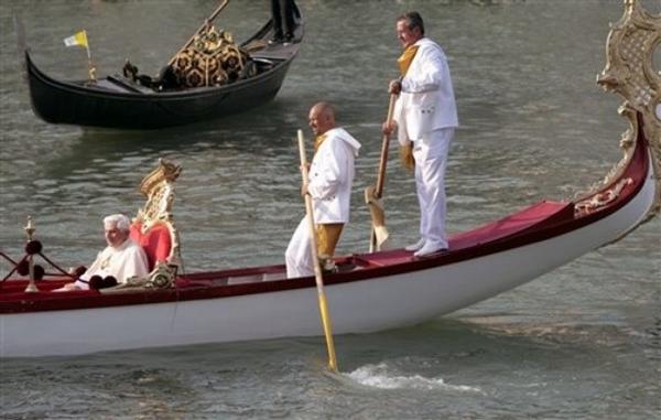 After the Mass, in scenes reminiscent of Pope John Paul II’s visit to Venice in 1985, Pope Benedict crossed Venice’s Grand Canal in a gondola river boat. His destination was the church of Our Lady of Good Health, where he delivered a speech to leading figures from civil society.